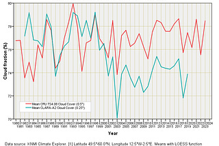 I analyse not one, not two, but three datasets to get a feel for what clouds have been doing over the UK