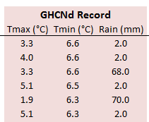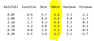 That sequence of 44,44,44,44,43,43 for minimum temperature in Fahrenheit looked suspicious to me so I searched for the Centigrade equivalent (6.6 etc) and found them under this column: