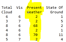 Guess where I found the data sequence of 2,2,68,2,70,2? That’s right, I found this data sequence under the column headed ‘Present Weather’. Obviously. Fine. Right…