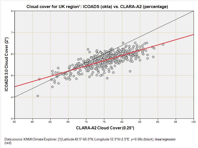 Well, the CRU dataset looks promising and is reasonably up to date, so I’m inclined to rely on this, especially in light of the excellent agreement with the latest, hottest CLARA-A2 satellite observations. By choosing CRU I can also do a bit of corrective modelling of the wonky WWII ICOADS okta values, thereby extending observations back to 1853.