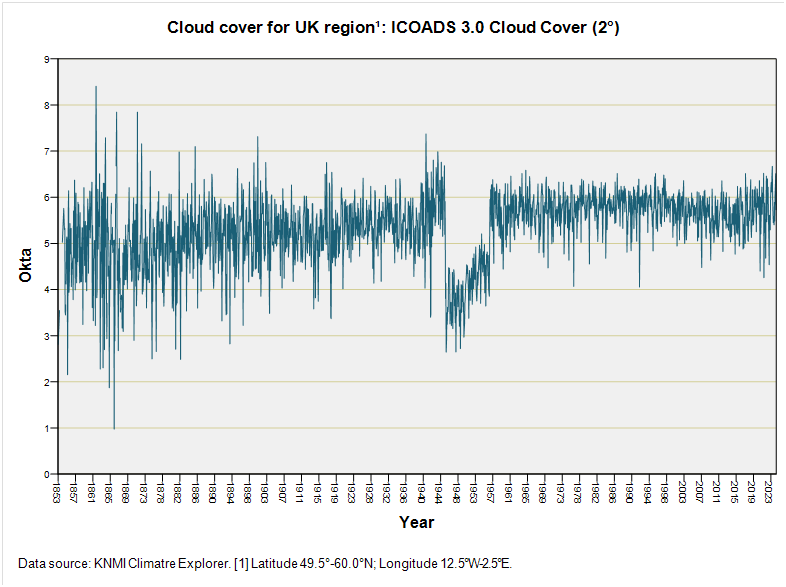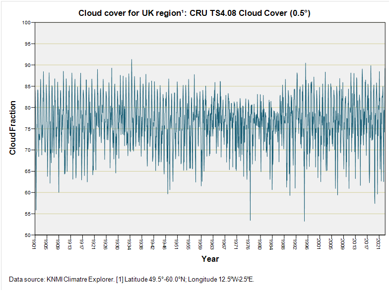 Assuming everybody involved got their act together by 1960 then my eyeballs don’t detect anything much happening, though there appears to be a subtle decline in cloud cover up to around 2015 when things started to gently ramp up. I’ll be looking at this in a moment or two, but for now let’s go straight in with the CRU TS4.08 0.5° gridded cloud cover dataset for the same region: