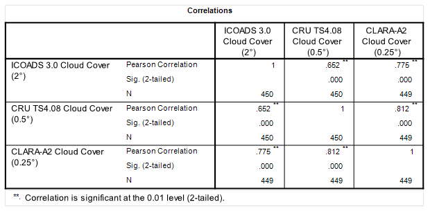 OK, so that’s interesting. The winning pair turns out to be CLARA and CRU, with r = 0.812 (p<0.001, n=449), with CLARA and ICOADS picking up the silver medal with r = 0.775 (p<0.001, n = 449). In the bronze position we have ICOADS and CRU with r = 0.652 (p<0.001, n=449).