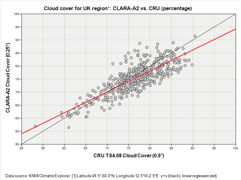 Now that’s a belter! This is precisely what I’d expect to see if two state-of-the-art datasets were offering up different estimates of the same thing over the same time frame. In Pearson terms we are looking at r = 0.812 (p<0.001, n=449). Nice one. The linear regression (red) has picked up something interesting in that it predicts a statistically significant intercept of 13.9% (p<0.001) for CLARA-A2 when CRU indicates zero cloud cover. This has the effect of twisting the fit a little such that the rate of increase for CLARA-A2 when regressed on the CRU data is not unity as we may expect but 0.80 (p<0.001). Whilst this is mildly curious, the BIG story here is that we’ve got two datasets in excellent agreement – phew!