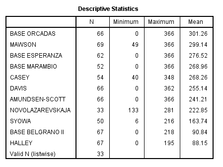 Please do bear in mind that just because 35 bases were delivering daily records in any one year doesn’t mean that they were collecting data 24/7/365 during that year. What we can do to get a handle on data capture is to count the number of daily records logged for each year of operation, thence to tabulate mean annual daily records in descending order. When we do this we find Wilkes Station coming out top of the decent data pile with a mean of 350.7 daily records per year for the 7 years it was open (1957 - 1963). Bottom of the pile is Fossil Bluff with a mean of 0.50 daily records per year for the 4 years it was open (2003 - 2006). This might sound like a crazy average but it boils down to just two temperature measurements in four years!