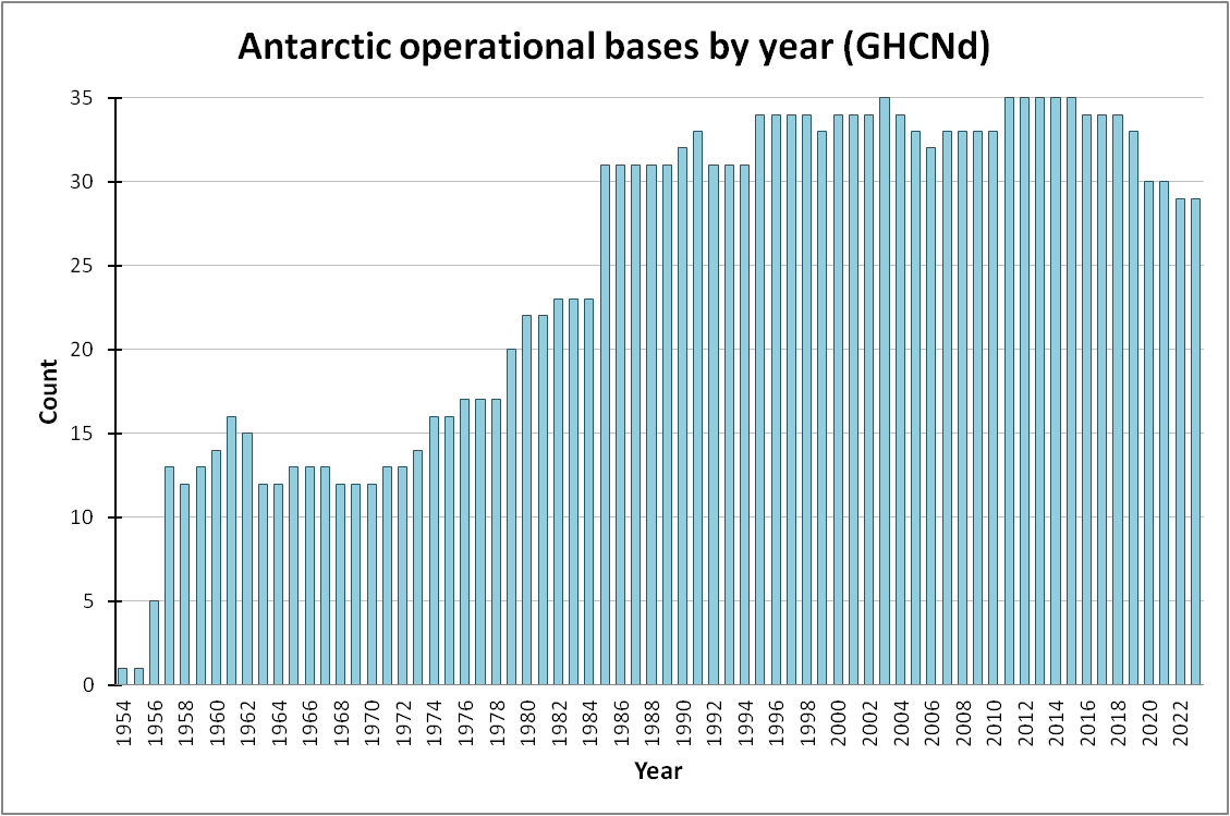 Out of a total of 56 bases offering daily data some 29 are still in operation in 2023 (51.8%), which is a good start, so let us have a look at the number of operational (in a daily sense) bases over time: