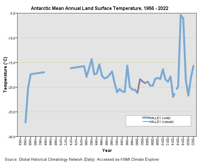 The good news is that, having access to daily records for all 56 bases, I can crunch my way through a spreadsheet to arrive at a set of reasonably robust annual mean temperatures for bases whose data collection rate surpassed 50% in any one year. I can also crunch a series of ‘wild means’ by ignoring the number of daily records gathered each year. To illustrate this, here’s a plot of wild and robust means for Halley Research Station: