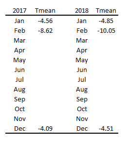 So how did that great scary spike of alarming warming at Halley appear? Let us have a look at the monthly mean temperature record for 2017 and 2018: