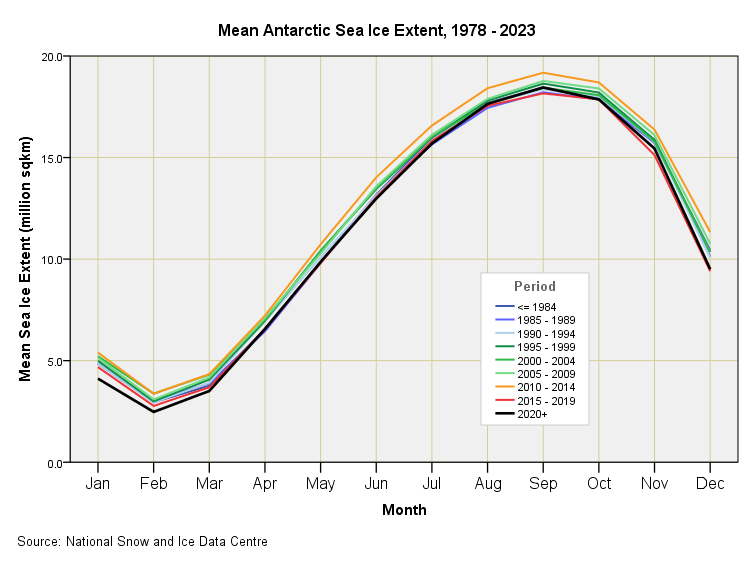 There isn’t a great deal of difference between periods apart from that generated by what could well be a change in definition, but at least we get to see the annual high is during September and annual low is during February, this being the inverse of the seasonal pattern we saw for the Arctic.