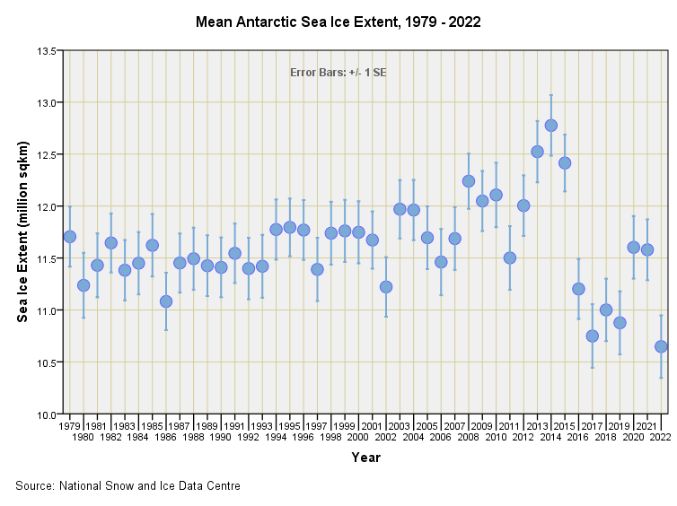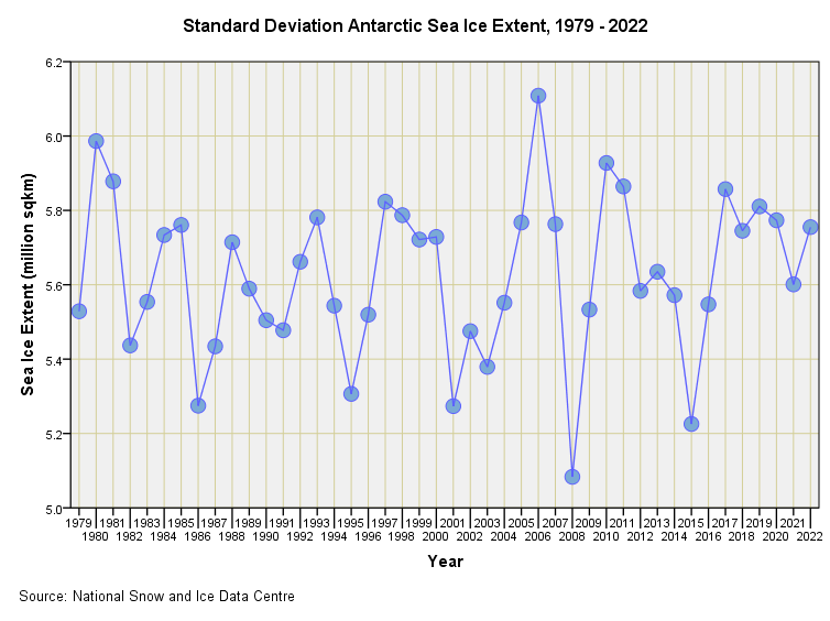 This looks pretty much like variation around a constant to me, whose mean is a standard deviation of 5.63 million square kilometres over the period 1979 – 2022. If I run this series through a Wald Wolfowitz runs test we discover it is a random walk (p=0.446), this supporting the notion that definitions/detection methods have changed rather than underlying ice melt dynamics.
