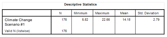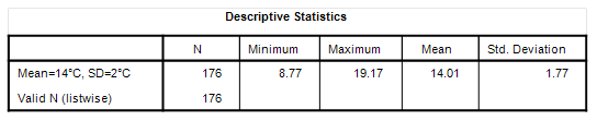 Let us now repeat the process but programme the random number generator to produce a normally-distributed series with the same mean of 14°C but a bigger standard deviation of 4°C: