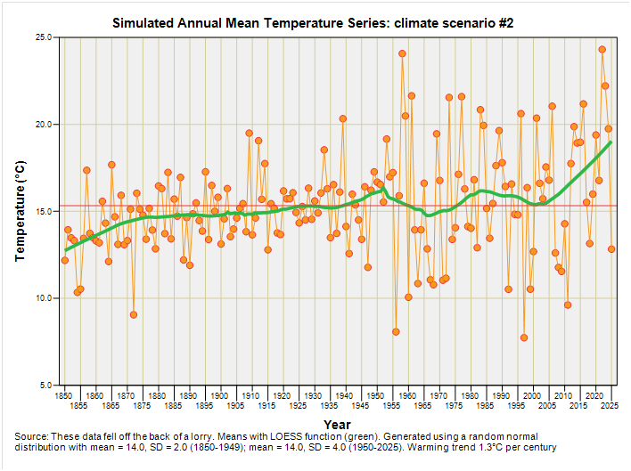 I’m going to make my scenario a little more realistic by adding a warming trend of 1.3°C per century to the simulation, as estimated by moi from the latest HadCRUT5 global mean anomaly. Here’s what we now have: