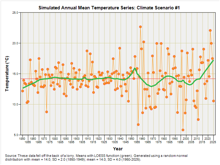 Let us assume that climate change in my simulated world started suddenly in 1950. Let us also assume that climate change is leading to wild fluctuations in temperature. Let us also assume that these wild fluctuations are generating record-breaking hot years as well as record-breaking cold years. What would this scenario look like? Well, I can cut & paste together the two simulated series we’ve looked at to produce this combi plot:
