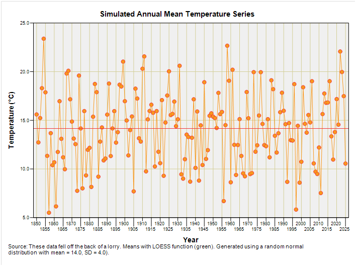 A graph of just 10 observations is going to be pretty boring so how about I churn out 176 observations and call the sequence ‘simulated annual mean temperature’? Cheeky, huh? Here’s what this looks like if I start the clock at 1850: