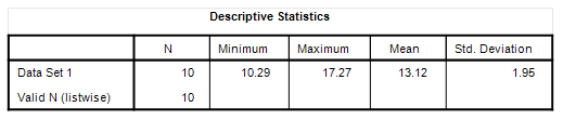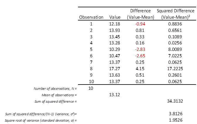 I shall start at the beginning with a very simple (simulated) dataset of just 10 observations, these being: 12.18, 13.93, 13.45, 13.28, 10.29, 10.47, 13.37, 17.27, 13.63 & 13.37. If you break out your trusty hand-held calculator you’ll discover their mean (a.k.a. average) comes to 13.12 (if we stick to 2 decimal places of precision). Let me now pop these down in an Excel spreadsheet and add a few simple calculations that reveal how the variance and standard deviation are derived…