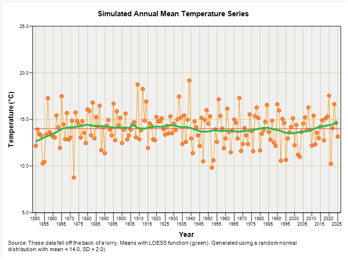 I had assumed everybody was with me on this but perhaps not. Once you grasp the nettle on this the cat is out of the stable and the milk has spoiled, so what I thought I’d do today is ensure everybody is up to speed and crisping nicely by running a few simulations to explain what (statistical) variance is, what it looks like, how we go about calculating it, and why it torpedoes the notion of man-made climate change below the waterline. I shall be doing this in best bib and tucker and with good grace as a former G7 head of a statistical modelling section in the service of Her Majesty’s Government. I shall also use my (expensive) professional stats package as well as Excel.