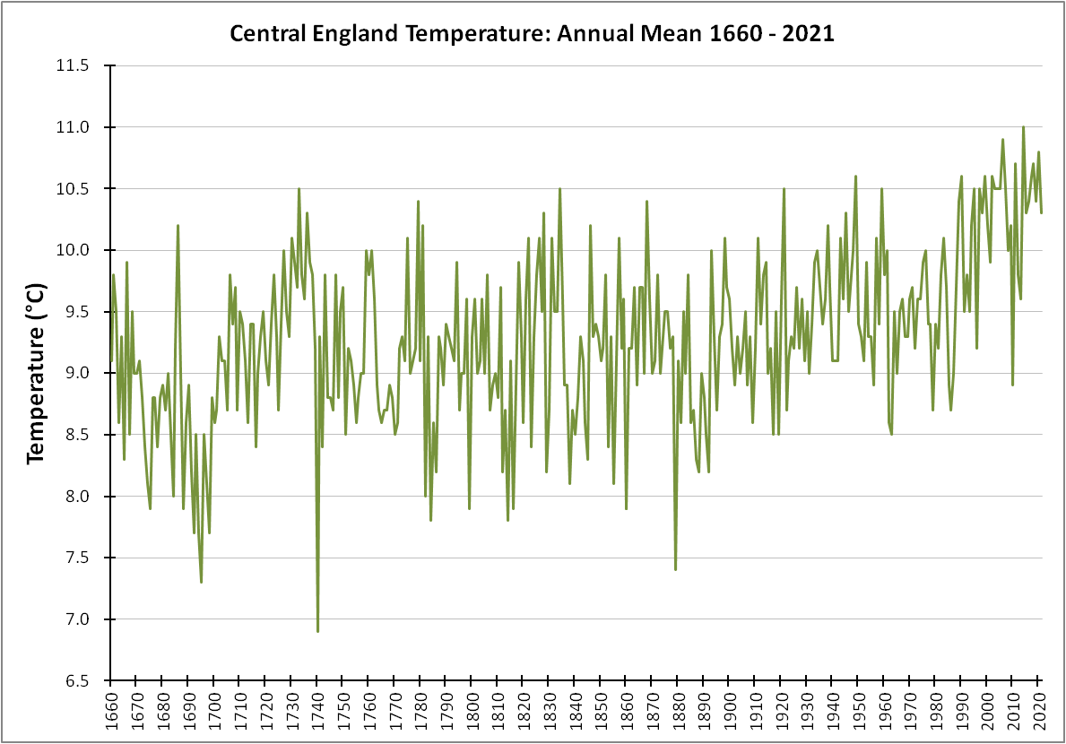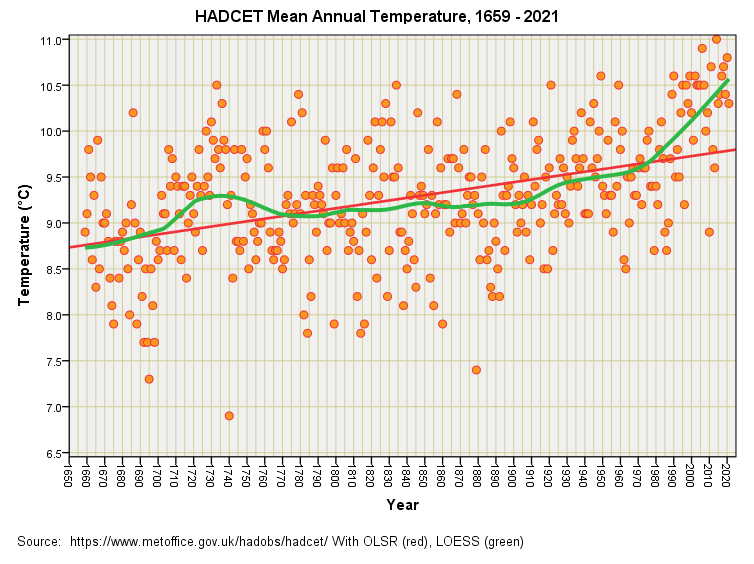 If we take the long view of 1659 – 2021 then the overall warming rate for Merrie England fetches up at +0.003°C per year (p<0.001; OLSR) or just 0.3°C per century, this being significantly less than the IPCC global estimate of +1.5°C per century.