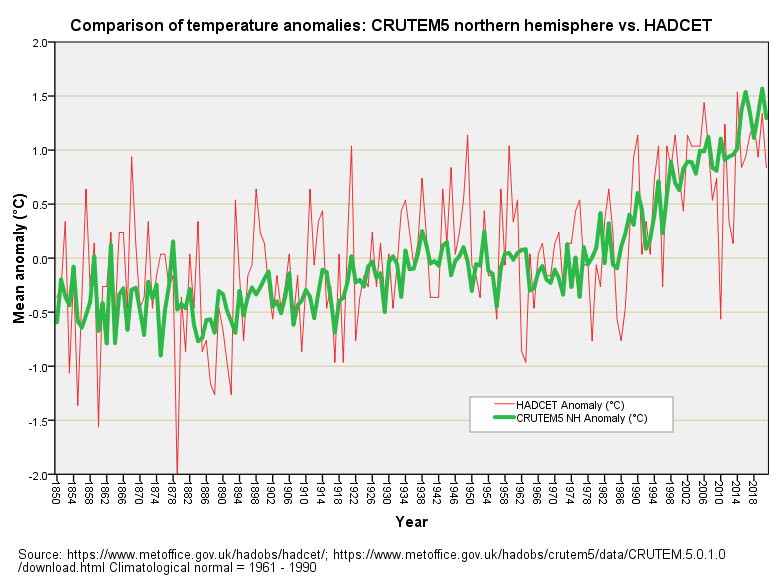 The crew at CRU produce the CRUTEM state-of-the-art land surface temperature anomaly series, copies of which may be found here. We’ve seen how the CRU crew somehow managed to cool the rather warm 1930s and 1940s in relation to a sample of 34 UK weather stations in this article, and so I thought I’d cross-check matters using the venerable Central England Temperature dataset (HADCET). To do this I converted the annual mean series into anomalies using the WMO 1961 – 1990 climatological normal. Herewith the result: