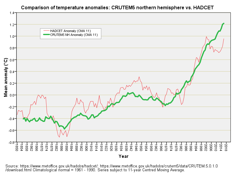 Once again we see a somewhat compressed CRUTEM5 series in relation to a decently varying series arising from actual temperature data, this compression arising from substantial data processing. And once again we see evidence of a cool-running CRUTEM over the period 1930 – 1960 or thereabouts, with hints of artificial cooling creeping in to earlier periods.