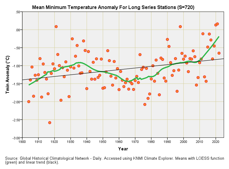 We observe cyclical behaviour along with an overall trend upward, with linear regression indicating a highly statistically significant warming trend of +0.47°C per century (p<0.001). According to this sample of between 458 and 670 GHCNd stations our days have not been getting hotter and hotter over time but our nights have certainly been getting less cool.
