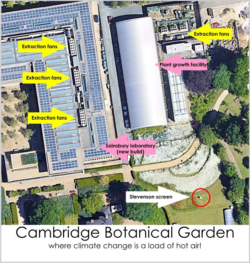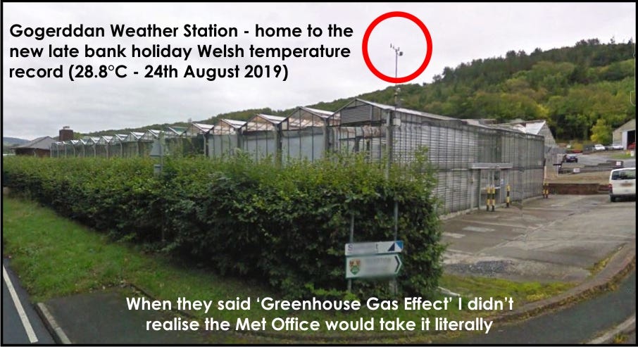What folk need to get their head around is the numerical fraud that is being perpetrated by Met Offices when they say “the hottest temperature on record since records began”. Firstly, you can bet your bottom dollar that all record-breaking UK temperatures are made at airports (e.g. Heathrow) or adjacent to greenhouses (e.g. Gogerddan) or next to some recent substantial development that hasn’t been mentioned (e.g. Cambridge Botanical Garden), these being places that consistently record higher temperatures owing to the considerable urban heat island effect.