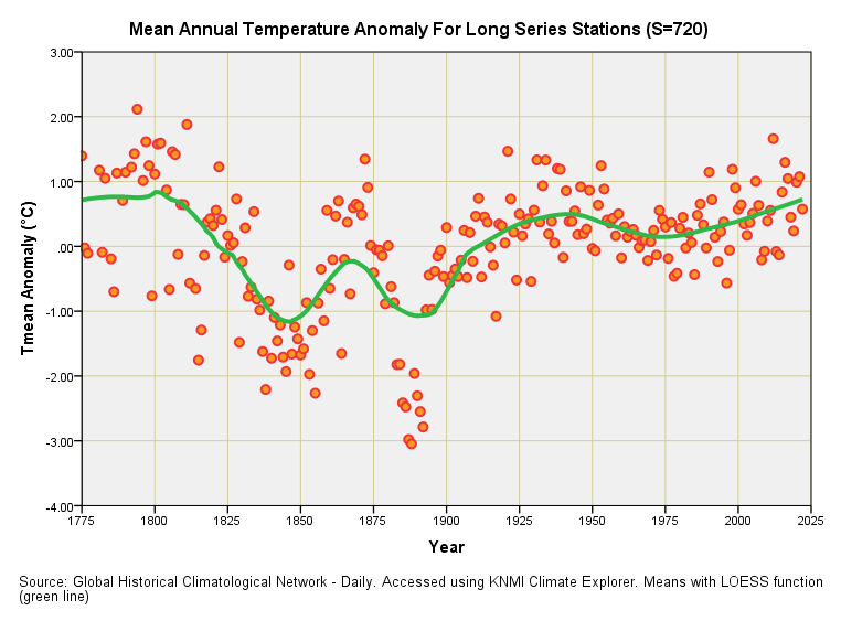 Some 720 GHCNd stations were identified with daily mean temperature records stretching for 123 years or more and this is what their combined mean annual anomaly series looks like: