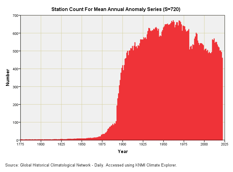 We discover that, out of that short list of 720 GHCNd stations with records stretching back 123 years and more, only six hundred-odd managed 95% data capture back in the glory days of real science. If I’m being precise about this we observe a peak in activity of 670/720 (93.1%) during the year 1962, with a waning of enthusiasm since then. There’s a flurry of fresh activity around 1988 when the IPCC got going (quelle surprise!) and another flurry around 2009. Come 2022 and we’re back to the level of observation we observed back in 1904.