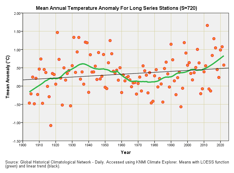 Today I am going to treat those who have taken out a paid subscription by doing something terrifically tasty. I am going to run a KNMI query on the entire GHCNd dataset and ask for daily mean temperatures for every station on the face of the globe with records stretching back 123 years or more. The query will then crunch the overall annual mean from this matrix for those years with 95% data capture or better, converting everything into standard WMO anomalies.