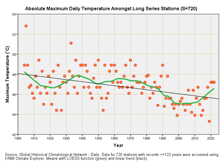 Whilst we’re on the subject of record-breaking temperatures let us crank the handle and plot out the highest daily temperatures recorded at those 720 long series stations held in NOAA’s GHCNd database: