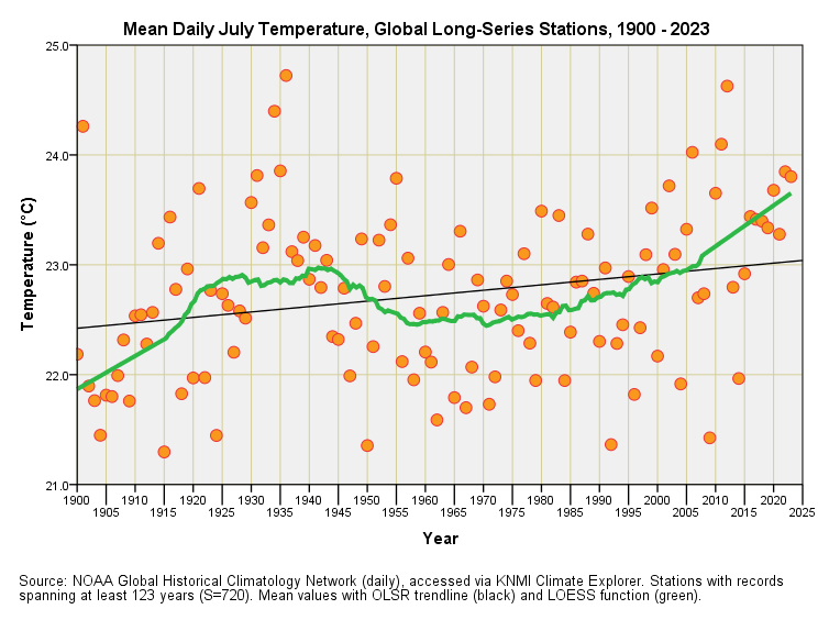 As for July 2023 I can report that this managed to scrape 20th position with 30.14°C, with the gold going to 1936 (32.07°C), the silver going to 1934 (31.64°C) and the bronze going to 1901 (31.43°C). Not exactly good news for alarmists, I admit, but this is what records held at long-running land surface stations tell us.