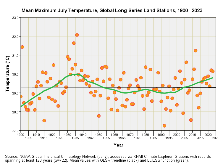 As humans in bodily form we can only experience the absolute temperature from hour to hour, but since not everybody lives in Addis Ababa and other scorchio places then the mean daily maximum temperature is a better measure for assessing generalised heat. However, whatever measure of extreme heat we elect to use we observe that July 2023 was most certainly not the hottest month in recorded history, and that the land surface where us humans live and read newspapers does not appear to be warming. This fits in with our collective experience of July starting warm but turning into a damp squib.