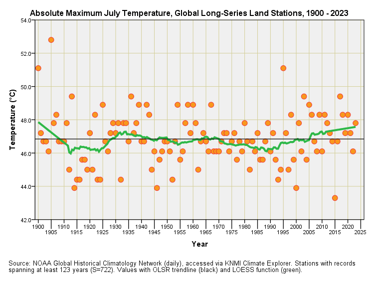 Let us get real for a moment and take a look at the profile for the absolute maximum daily July temperature as recorded amongst 722 long-series GHCNd weather stations that possess records stretching back at least 123 years. Anybody wanting to run this analysis for themselves can do so by clicking here:
