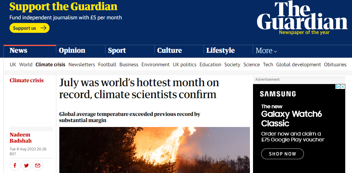 Just over one week into the new month and talking heads were already announcing that July 2023 was likely to be the hottest month on record EVER; a bold statement indeed with three weeks of the month left to run! And then, with just a few days into a dismal start to August, we had the mainstream media announcing that July 2023 has been confirmed as the hottest month on record EVAH! Here’s the newspaper of the year telling us so on Tuesday 8th August: