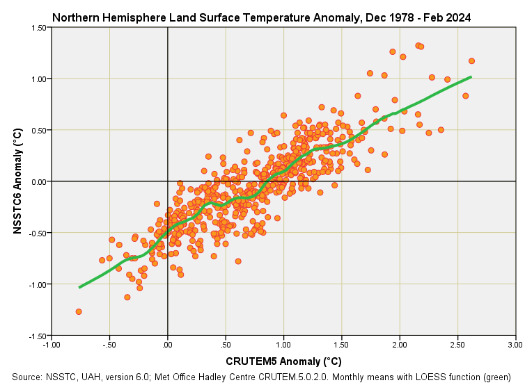 Readers are going to notice two things straight away. First, they’re going to note that the NSSTC lower troposphere northern hemisphere (NH) land surface anomalies are running cooler than their CRUTEM5 counterparts. Secondly, they’re going to note that the NSSTC lower troposphere NH land surface anomalies exhibit less warming over this period than their CRUTEM5 counterparts: so let’s put some numbers to this.