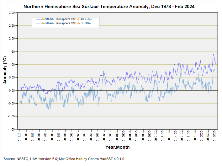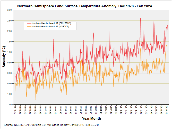 I finished the article by promising to get back on track with the NSSTC satellite data and it seemed a logical next step to see how this sophisticated data fares against data gathered in a more conventional manner using an actual thermometer. Thus, today I’m going to pull down fresh data for two state-of-the-art conventional datasets, these being the CRUTEM5 land surface temperature (LST) anomaly and the HadSST4 sea surface temperature (SST) anomaly for each hemisphere separately, and then I’m going to compare these four time series with the four equivalent hemispheric time series for freshly-picked NSSTC v6.0 lower troposphere land and ocean anomalies. The handy thing about satellite data is that it offers much greater coverage of our planet’s surface and isn’t wobbled by localised factors such as corrugated iron and concrete: we want to chase man-made warming and not man-made warming!