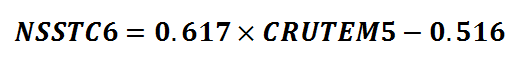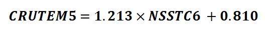 There’s no wonky stuff here that points to non-linear bias that would need to be carefully explained, and which would be terribly awkward for everyone. When we do throw a bog standard linear regression down we arrive at this simple equation for converting between NSSTC6 and CRUTEM5 values (with a bit of error thrown in, of course):