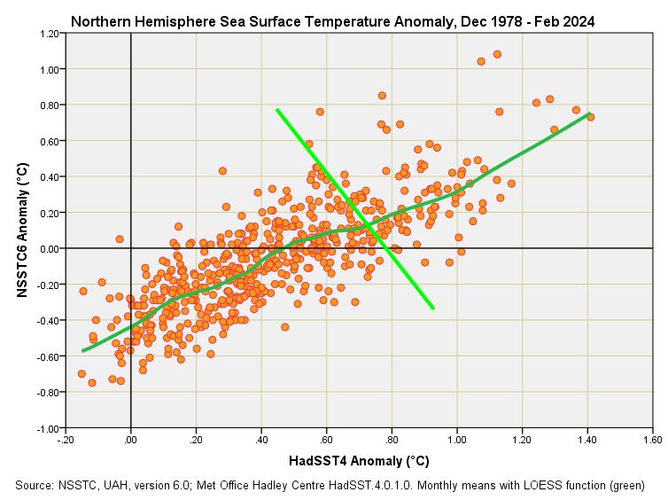 The HadSST4 data from 2004 on has a sinusoidal wave on top of the trend. If annual variation why not up to 2004 or in the NSSTC6 data. Looking forward to your ruminations. Regarding the last scatterplot from about 0.8 degC (HadSST4) the LOESS line seems by eyeball not to be a good fit to the data (running low). My eyes or LOESS issue?