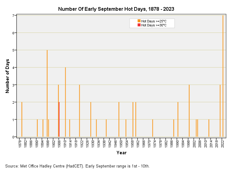 With ranting done what I’ll do now is count the number of days within the Central England Temperature Record that met or exceeded a daily maximum of 25°C or 30°C. I can then aggregate these counts for the period 1st – 10th for all Septembers over the period 1878 to 2023. Herewith a plot of the results: