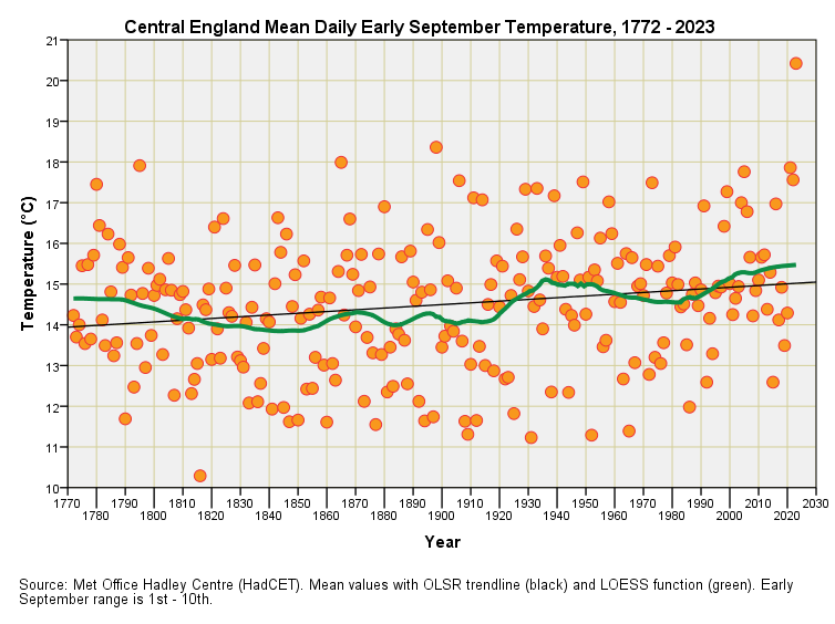 This brings us on to this month, and what a splendid month it has been for fine weather! One of those decent ends to the summer that crusty Boomers like myself can’t get enough of whilst Millennials/Gen-Y/Zoomers/Gen-Z stress to the max over the prophesied greenhouse apocalypse. Admittedly, there haven’t been many gloriously warm UK Septembers over the last few decades and so I wondered if this month may have broken a record or two. I thus removed the purple tunic of the heat denier, donned the orange vest of the soup throwers and went in search of the Central England Temperature record, which may be found here.
