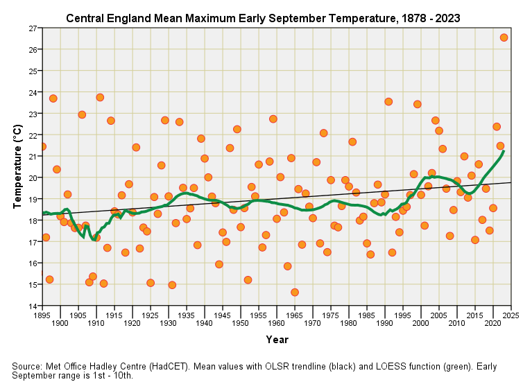 We can see that 1st – 10th September 2023 has broken all records with a mean of 20.42°C, with silver going to 1898 (18.36°C) and bronze going to 1865 (17.99°C) – scorchio indeed! You may start throwing soup now. This year is a right royal outlier, make no mistake, which may explain the quantity of salad I’m eating.