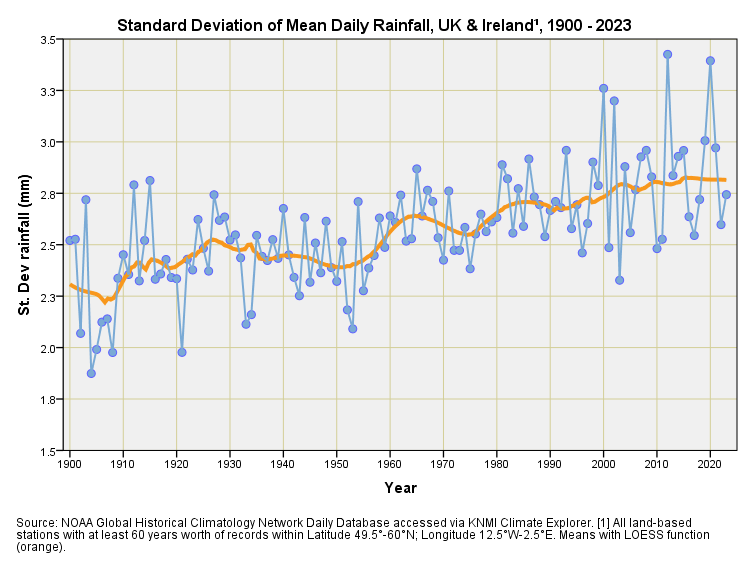 If nobody minds I’d like to plough straight into scatterplots of mean daily rainfall and the standard deviation of mean daily rainfall for the period 1900 – 2023 when squeezed into annual-sized averaging pots. If the term standard deviation glazes eyeballs think of this as simply as measure of the daily variation in rainfall over the year instead of the daily amount: