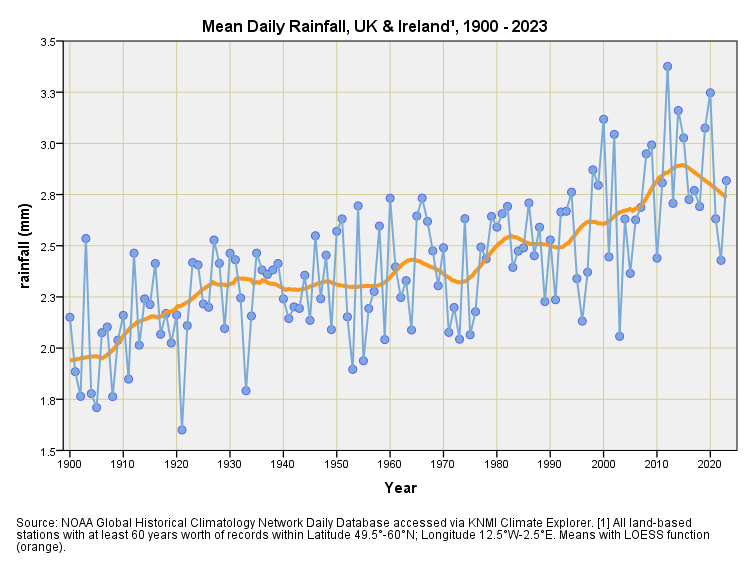 Storms also make us wet, so I decided to take a look at how wet the UK has gotten these past few decades…