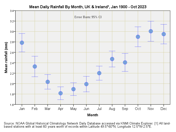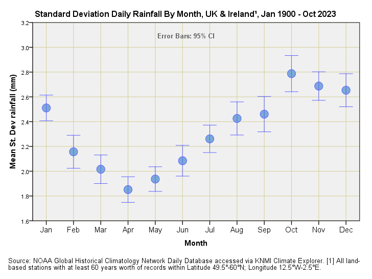 To finish we’ll take a look at the seasonal stuff in terms of mean daily rainfall and standard deviation of daily rainfall by month for the period Jan 1900 – Oct 2023: