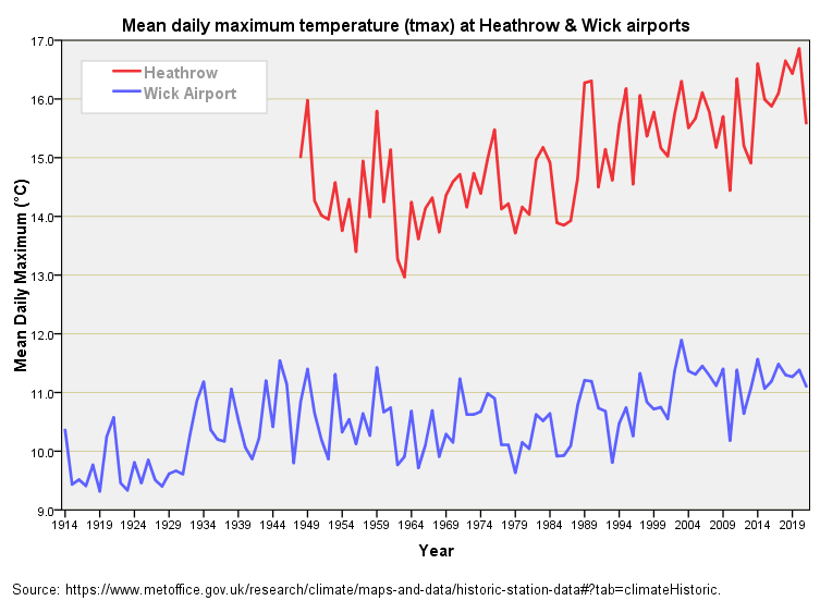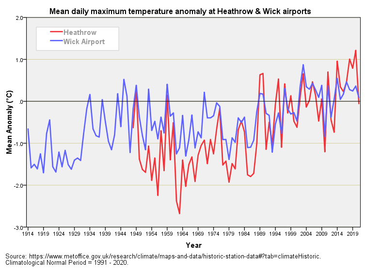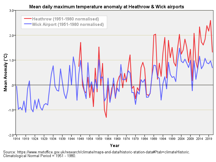 So what can we glean from this? Well, what has caught my eye is the red bit sticking up from 2014 onward. Despite both Heathrow and Wick being normalised to the period 1991-2020 this means that Heathrow has been getting hotter than Wick in recent years, ergo this cannot be a global phenomenon.