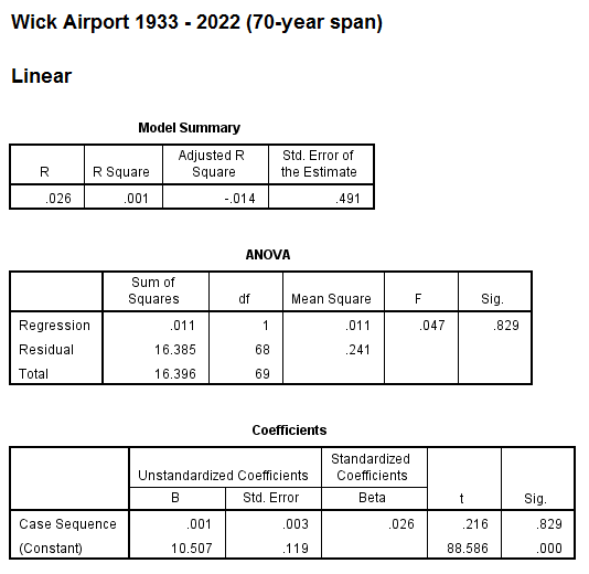 Before we leave this slide alone it is worth noting the rather stable 70-year period at Wick Airport that spans 1933 - 2002 or thereabouts. Given airport use and development would have progressed during this era, then I must logically deduce that the climate probably cooled at this location. I’m not sure activists will like this finding very much, so we better check with a spot of linear regression: