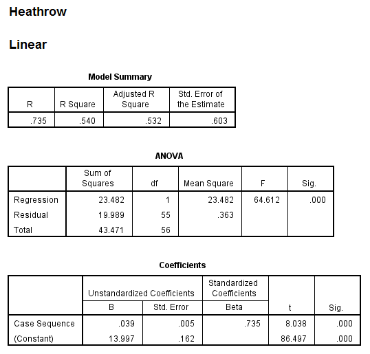 This leaves us with a late upturn in warming from 1965 onward. Whilst this is evident at both airports, it is far more evident at Heathrow and this is likely due to urban development. What I’ll do now is reach for one of those linear regressions (a.k.a. the small spanner) and establish the warming trend for 1965 - 2021 for both airports. Herewith two servings of stats output: