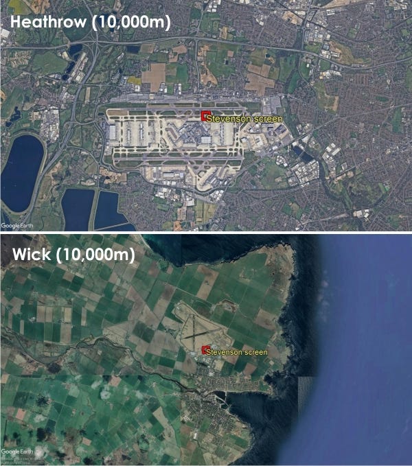 Turning back to our brace of coefficients we see that Heathrow is warming faster than Wick to the tune of 0.018°C per year or 1.8°C per century. What causes my eyebrows to twitch is that this is greater than the estimated global warming rate of 1.5°C offered by the Intergovernmental Panel on Climate Change (IPCC) when they issued Special Report SR15. This begs the question: are we being taken for an urban ride?