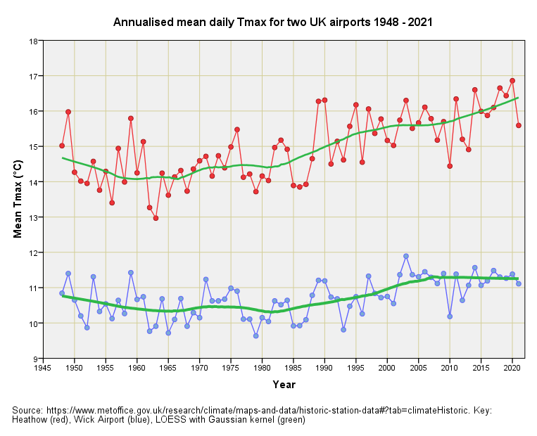 So let’s have a look at tmax for Heathrow and Wick for the period 1948 - 2021: