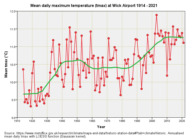 We can attempt to answer this question by looking up at satellite data gathered since 1979 (more on this in future newsletters) and by taking a closer look at the state of our land based weather stations (more on these in future newsletters). Whilst the oven is still warm we might as well take a look at what isolated Wick has been doing since it started collecting data in 1914: